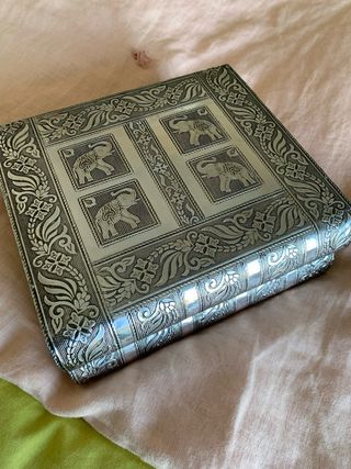 Elegante joyero de metal plateado. Ideal para guardar tus joyas de forma segura y organizada. - Diseño con grabados de elefantes. - Acabado brillante y detalles cuidados. - Perfecto para añadir un toque de estilo a tu tocador.