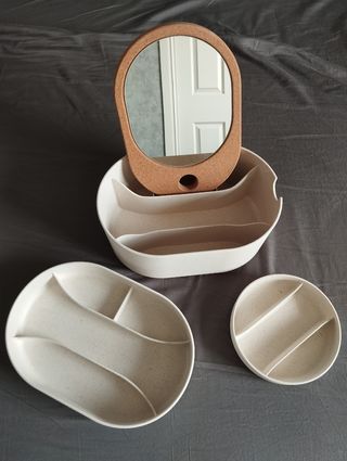 Preciosa caja joyero de Ikea, modelo Saxborga. Está nueva y es perfecta para organizar tus joyas y accesorios. Incluye tres compartimentos: uno grande y dos pequeños, uno circular y otro ovalado. - Diseño elegante y funcional. - Material resistente y fácil de limpiar. - Espejo integrado.