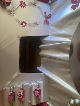 Precioso joyero para disfraz, ideal para adultos. Es un diseño bonito y elegante. - Elaborado artesanalmente - Fabricado en carton reforzado con listones de madera y esquineros. - Forrado totalmente con goma eva de purpurina rosa y plateada y detalles brillantes. PRECIOSO. - Dispone de 4 ruedas y no se puede desmontar ni articular, se necesita remolque o furgoneta grande para trasportar