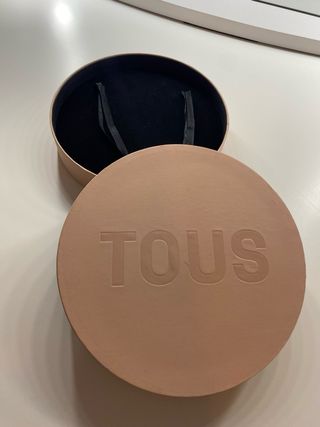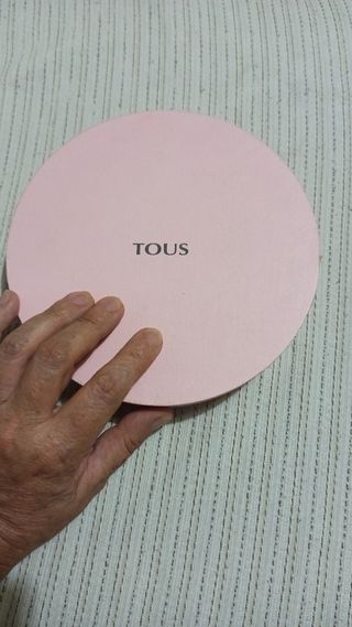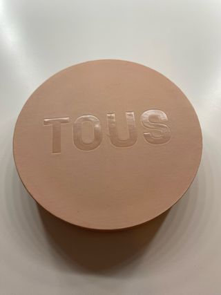 Elegante caja de la marca Tous, de gran tamaño y en un bonito color rosa. - Diseño circular. - Logo de la marca grabado en relieve.