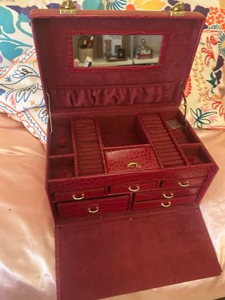 Elegante joyero con compartimentos para organizar tus accesorios, con interiores forrados con suave terciopelo rosa. Se compone de 3 pisos: - Primero se accede por la tapa, con compartimento para anillos. - Segundo y Tercero, cajones, uno con compartimentos y otro totalmente liso para las piezas mas grandes. - Dimensiones: 25 cm (ancho) x 18 cm (fondo) x 15 cm (alto) En perfectas condiciones.