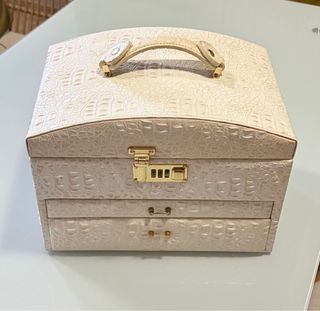 Elegante joyero de color beige, perfecto para organizar tus accesorios. - Diseño cuadrado con esquinas reforzadas. - Asa superior para facilitar su transporte. - Cerradura metálica con llave incluida.