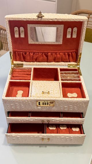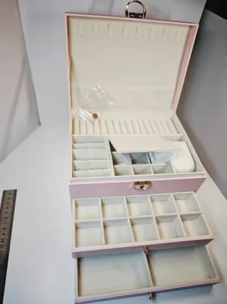 Elegante joyero de gran tamaño en color rosa, perfecto para organizar tus accesorios. - Diseño de tres niveles con múltiples compartimentos. - Incluye un espejo interior. - Cierre con llave para mayor seguridad.