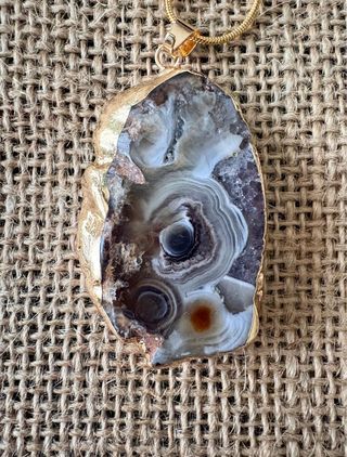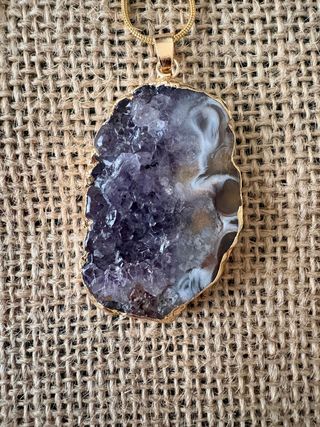 Elegante colgante con una gran piedra de ágata natural, engastada en un baño de oro. La pieza destaca por su diseño único y los vibrantes tonos morados y blancos de la piedra. - Colgante de ágata de gran tamaño. - Acabado en baño de oro. - Diseño natural y orgánico. - Se entrega en joyero ideal para regalar.