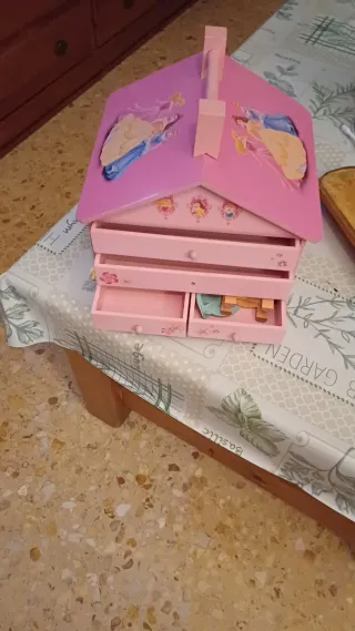 Precioso joyero de madera con diseño de casa de muñecas y motivos de princesas. - Decorado con imágenes de princesas. - Estructura de madera. - Múltiples cajones para organizar. - Asa superior para transporte.