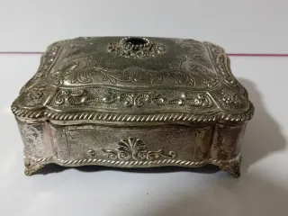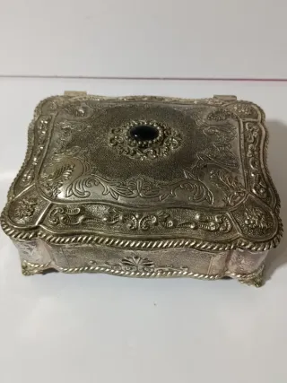 Elegante joyero antiguo con incrustación de piedra negra. Mide 18 cm de largo X 14,5 cm de ancho X 7 cm de alto. Pesa 952 gramos. La arte interior está forrada de tela negra y la base está forrado con tela azul.