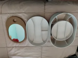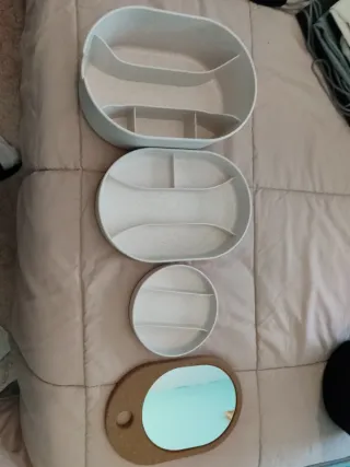 Set de organizadores de joyero y tocador. - Organizador ovalado grande con compartimentos. - Organizador ovalado mediano con compartimentos. - Organizador redondo pequeño con compartimentos. - Espejo ovalado con marco de corcho.