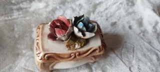 Precioso joyero o bombonera vintage de cerámica estilo Capodimonte (años 60-70). Decorado con dos grandes flores aplicadas a mano en tonos teja y azul. Diseño clásico con relieves y detalles dorados. Estado: Vintage. Presenta ligeros roces/faltas en los bordes de algunos pétalos (ver fotos de detalle), algo muy común en este tipo de cerámica delicada. Sin grietas en el cuerpo ni reparaciones. Medidas: 11 x 7 x 11 cm. Peso: 296 g. Ideal para tocador o decoración Shabby Chic. Envío muy protegido.