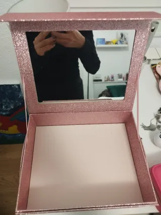Elegante joyero con compartimentos para organizar tus accesorios. - Interior forrado en tela rosa. - Espejo ovalado integrado en la tapa. - Incluye una pequeña llave para cerrar el compartimento principal. - Hueco para joyas grandes