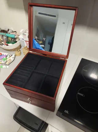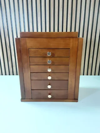 Bonito joyero de madera 38 cm de alto es bastante grande ,tiene algún rozecillo apenas se nota ,gran capacidad ,y bonitos cajones