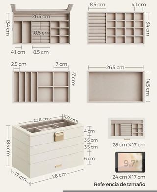 SONGMICS Caja Joyero de 4 Niveles Blanco Nube y Dorado Especificaciones: Color: Blanco Nube Material: MDF (Tablero de Fibra de Densidad Media), PU (Poliuretano), Terciopelo, Cristal Dimensiones: 15,3 x 25,1 x 21,5 cm (Profundo x Ancho x Alto) Peso: 1,7 kg Contenidos del paquete: 1 x Caja de joyería Almacenamiento de 4 niveles: Guarda tus accesorios de forma ordenada en esta caja de joyas. Las joyas pequeñas se guardan en los compartimentos de diferentes tamaños, las gafas de sol y los relojes están en el cajón grande del fondo Tapa de Cristal Transparente: Todas tus joyas favoritas son visibles bajo la superficie de cristal transpa