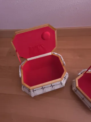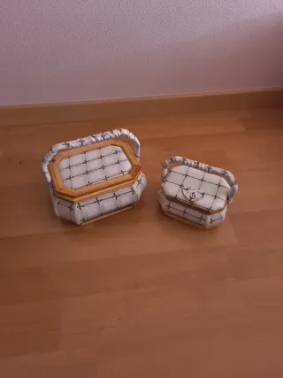 Set de dos cajitas decorativas, ideales para guardar joyas o material de costura. Están sin estrenar. - Una cajita es más grande que la otra. - Ambas tienen un diseño a cuadros. - Cuentan con asas flexibles.