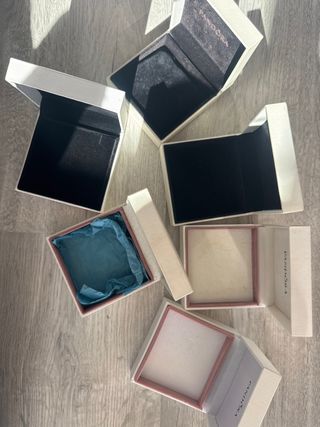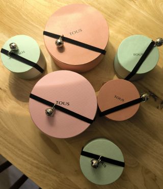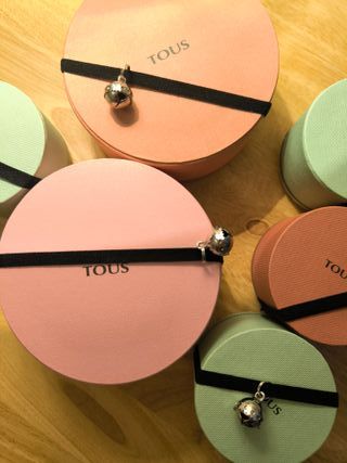 Conjunto de 6 cajas de joyería de la marca TOUS. Presentadas en tonos verde y rosa, cada caja está adornada con una cinta negra y un charm colgante. - Incluye varias cajas de diferentes tamaños. Tamaño pequeño 5 centímetros, y Tamaño grande 10. - Cintas negras decorativas. - Charm colgante en cada caja. Todas perfectas, sin roces. En el interior disponen de almohada / protector de espuma para colocar el artículo. Todas las cajas por 8 euros.
