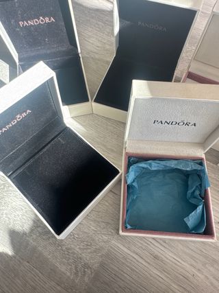 Conjunto de seis cajas de la marca Pandora, ideales para guardar joyas. - Diseño elegante en color blanco. - Interior forrado en terciopelo negro o rosa. - Cajas de diferentes tamaños, perfectas para anillos, pulseras o collares.