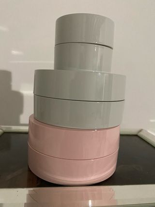 Pack de 5 cajas grandes vacías de Tous. 4 en color rosa palo y una en verde. En buen estado aunque una de ellas tiene unas marquitas en la superficie y dos de ellas tienen maquitas en la base tal y como se ve en las fotos. Tres de ellas tienen protectores interiores. Ideal para joyero o para regalo