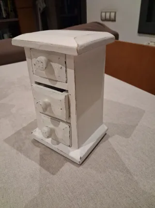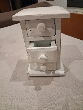 Vendo joyero de madera, pintado en blanco por mi, con 3 cajones, usado pero en buen estado. La capacidad de los cajones no es muy grande, para poner pendientes o anillos. Tiene una altura de 19 cm.