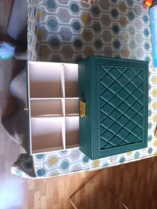 Magnífico joyero grande y espacioso para tus joyas,relojes o piezas de mayor valor sentimental o monetarias Fabricado con mucha exquisitez tanto el interior de piel verde y su interior en terciopelo,para el más cuidado de tus enseres Fabricación de muy buena calidad. Muy bonito no te arrepentirás de poseerlo👋.