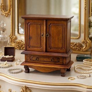 Elegante joyero de madera con un diseño clásico. - Estilo vintage. - Acabado en madera oscura. - Puertas frontales con tiradores.