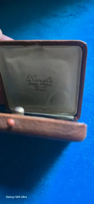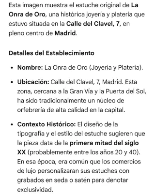Este es el estuche original de La Onra de Oro, una histórica joyería y platería ubicada en Madrid. ¿Eres regentada, por grandes personalidades? Cómo la familia real entre otros con más de un siglo, de historia - Ubicación: Calle del Clavel, 7, Madrid. - Contexto Histórico: Diseño y estilo sugieren que la pieza data de la primera mitad del siglo XX (años 20-40). - Personalización: Común en la época para joyerías de lujo, con grabados en seda o satén para denotar exclusividad.