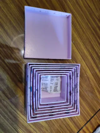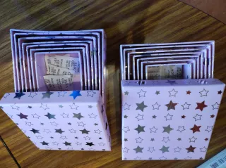 Conjunto de cajas decoradas con estrellas. Cada conjunto tiene 7 cajas, de grande a pequeña, cada una con su tapa. Las mas grande mide 12,5cm x 12,5cm x 6,5cm La mas pequeña 6,5cm x 6,5cm x 3,5cm - Diseño en color rosa (la foto cambia un poco el color) - Estampado con estrellas plateadas que brillan Nuevas, nunca usadas. Cada conjunto de cajas 3€ (las dos 6€)