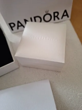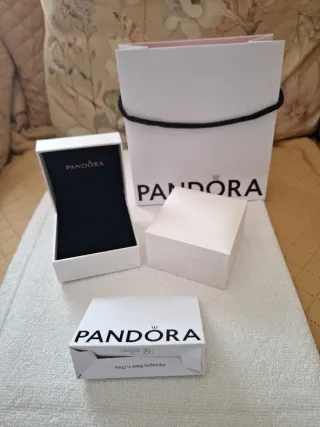 Conjunto de dos cajas rígidas de la marca Pandora, ideales para guardar anillos o pendientes. Son de color blanco y vienen con su bolsa y otra pequeña para charms de regalo. - Cajas rígidas. - Bolsa de la marca incluida.