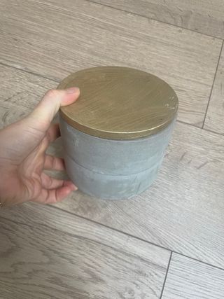 Elegante caja joyero de cemento con un toque moderno. Tiene dos compartimentos interiores ideales para guardar joyas, accesorios u objetos pequeños. • Material: cemento (muy resistente) • Tapa pintada en dorado • Diámetro: 12,5 cm • Altura: 11,5 cm • Diseño minimalista y decorativo Una pieza práctica y a la vez decorativa, perfecta para dar un toque original a cualquier espacio.