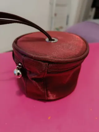 Pequeño joyero de forma redonda con un acabado brillante.altura 10 cm. Gran capacidad.ideal para guardar tus joyas favoritas - Cierre de cremallera. - Asa de mano. - Adorno colgante metálico.