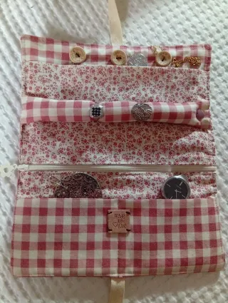 Joyero artesanal con un diseño de cuadros rojos y blancos y detalles florales. - Cierre de cremallera. - Varios compartimentos para organizar joyas. - Pequeño detalle made with love.