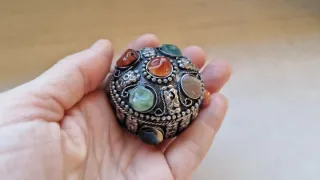 Conjunto de dos preciosas cajitas decorativas plateadas, perfectas para guardar joyas u otros pequeños objetos. - Una cajita es de cristal verde con tapa metálica adornada. - La otra cajita es metálica y está decorada con varias piedras semipreciosas de diferentes colores. Las dos 10€