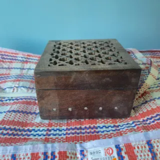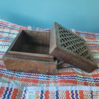 Bonita caja de madera con tapa tallada. - Diseño artesanal. - Ideal para guardar pequeños objetos. - Medida 13x13 (ancho y largo); profundidad 8 cm