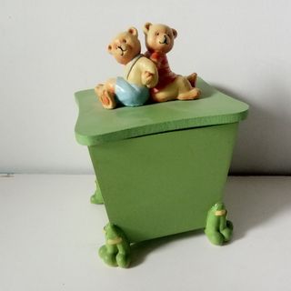 Adorable cajita de madera decorada con dos ositos sentados en la tapa y unas simpáticas ranitas como patas. Pintada, verde. Muy bonita para entregar llena de algún pequeño regalo o caramelos, bombones... #caja #cajita #cajitadecorativa #cajitaregalo - Diseño infantil. - Tapa con figuras de ositos. - Patas con forma de ranita.