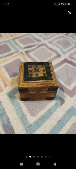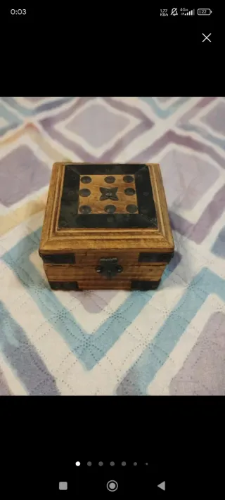 Preciosa caja artesanal de madera, perfecta para guardar tus joyas o pequeños tesoros. - Diseño con detalles metálicos. - Acabado rústico y elegante.