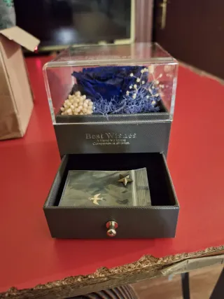 Pequeño estante o joyero con un rosa azul y demas detalles hermosos en su parte superior que tiene un pequeño cajón que sirve de joyero o para lo que gustes. Incluye esa bolsita de plástico con dos pins (uno de un pájaro y otro de una estrella), una carta de regalo con corazón y dos bolsas de regalo (una de tela y otra de cartón)