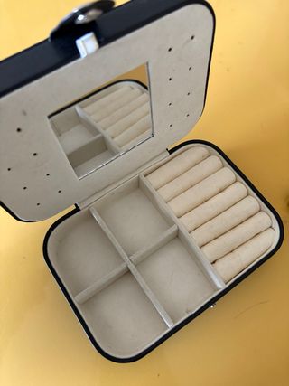 Pequeño joyero de viaje, perfecto para organizar tus accesorios. - Diseño compacto y portátil. - Interior forrado para proteger tus joyas. - Compartimentos para anillos y otras piezas.