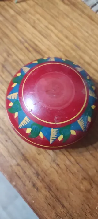 Pequeña caja vintage con un diseño decorativo. Está cajita joyero está hecha a mano de madera, pintada y lacada. Está muy bien conservada. - Base y tapa de color rojo y multicolor - Adorno con motivos geométricos en azul, verde y amarillo.