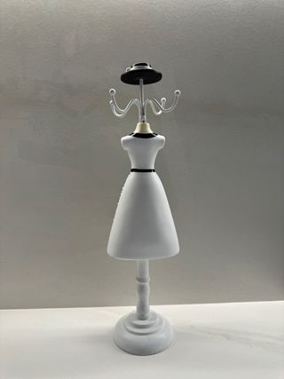 Original colgador para pulseras y bisutería con forma de vestido. - Diseño elegante con detalles en encaje. - Adorno de lazo blanco en la cintura - Soporte metálico en forma de percha.
