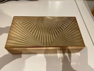 Elegante joyero metálico con un diseño al estilo Gran Gastby. - Acabado en tono dorado. - Tapa con relieve en forma de abanico. - Interior con dos compartimentos para joyas y un tercero para colocar anillos todo en negro. Tiene algunos pequeños signos de uso en el exterior.