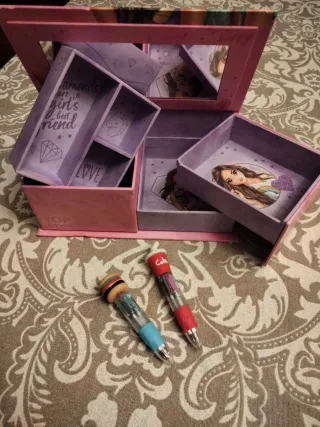 Joyero con compartimentos y espejo, ideal para guardar accesorios y pequeños tesoros. Diseño con ilustraciones de Top Model. Interior con múltiples compartimentos y cajoncitos para organizar pendientes, anillos, colgantes, horquillas y gomas de pelo... Tapa con espejo. 20x12x7 cm. Se regalan 2 mini bolis de múltiples colores.