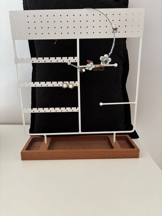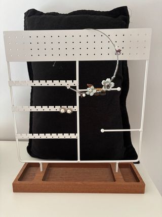 Este joyero organizador de varios niveles es perfecto para mantener tus accesorios ordenados. - Diseño estrecho y funcional. - Base de madera para guardar objetos pequeños. - Estructura blanca con múltiples colgadores. - Medidas: 35 cm alto, 30 ancho y 10 de fondo. Recogida en Pinar de Jalón (Valladolid)