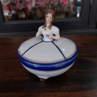 Preciosa cajita decorativa con una figura de porcelana. - Diseño con detalles en azul y dorado. - Tapa con figura de mujer. - Base con tres pequeños soportes.