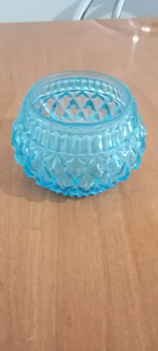 Pequeño joyero de cristal con un diseño labrado. - Material: Cristal. - Color: Azul. - Diseño: Labrado con rombos.