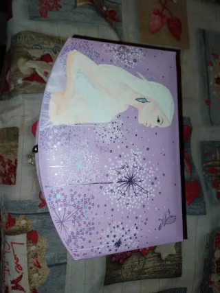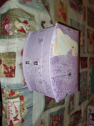 Precioso joyero con un diseño encantador y detalles delicados. - Decorado con mariposas y flores. - Acabado en tonos morados y rosas. - Cierre con dos pequeños pestillos plateados. -Dos cajones. -El espejo tiene marcas del uso pero se puede mirar.