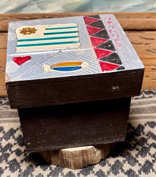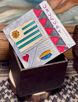 Bonito joyero con diseño inspirado en Uruguay. Ideal para guardar pequeños tesoros. - Decorado con la bandera de Uruguay. - Incluye un corazón rojo. - Detalle de un balón. - Inscripción 'URUGUAY'.