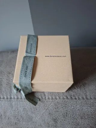 Pequeña caja para joyas de la marca Duran. Presenta un diseño elegante y es ideal para guardar accesorios. - Cinta decorativa con el logo excuse y DURAN. - Color beige y gris.