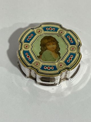 Pequeña y elegante cajita de plata de ley 925. Presenta un diseño octogonal con un delicado retrato en la tapa. Diametro 5,3cm - Plata 925 milésimas. - Decoración esmaltada multicolor. - Motivos florales y detalles en rojo y azul.