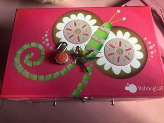 joyero rosa y verde de imaginarium con un compartimento centeal y dos cajones pequeños inferiores. Incluye candado y llaves Signos de uso y alguna mancha