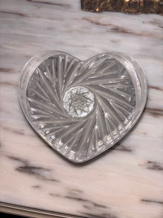 Preciosa cajita con forma de corazón, elaborada en cristal tallado. - Diseño en forma de corazón. - Cristal con tallado detallado. - Ideal para pequeños objetos o como pieza decorativa.
