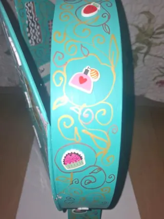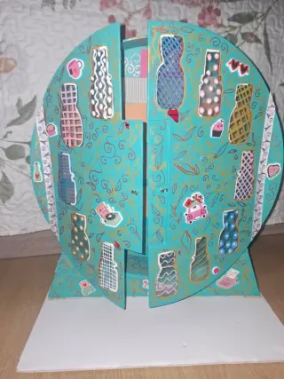 APROVECHA, FANTÁSTICO REGALO 🎁 IDEAL PARA TI O ALGUIEN QUE QUIERAS ESTAS PROXIMAS FIESTAS DENAVIDAD 🎄!!! DATE PRISA O TENDRÁS QUE PENSAR OTRO 🎁 REGALO! Este joyero único circular, reciclado y hecho a mano, presenta un diseño único en tonos turquesa y dorado. - Decorado con un intrincado patrón de hojas y espirales. - Adornado con pegatinas temáticas de moda y estilo de vida. - Puertas frontales que se abren para revelar el interior y ampliar el espacio de almacenamiento. Se adjuntan perchas pequeñas también hechas a mano...