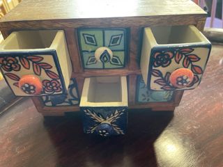 Pequeño mueble de madera con seis cajones decorados con azulejos. - Cada cajón tiene un diseño de azulejo único. - Tiradores de cerámica a juego con los diseños.
