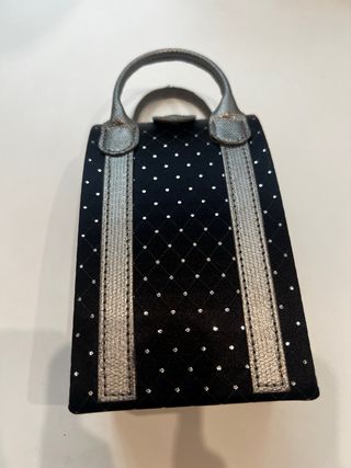 Elegante joyero con un diseño acolchado y detalles brillantes. - Diseño acolchado en forma de rombos. - Pequeños detalles plateados incrustados. - Asas superiores plateadas.
